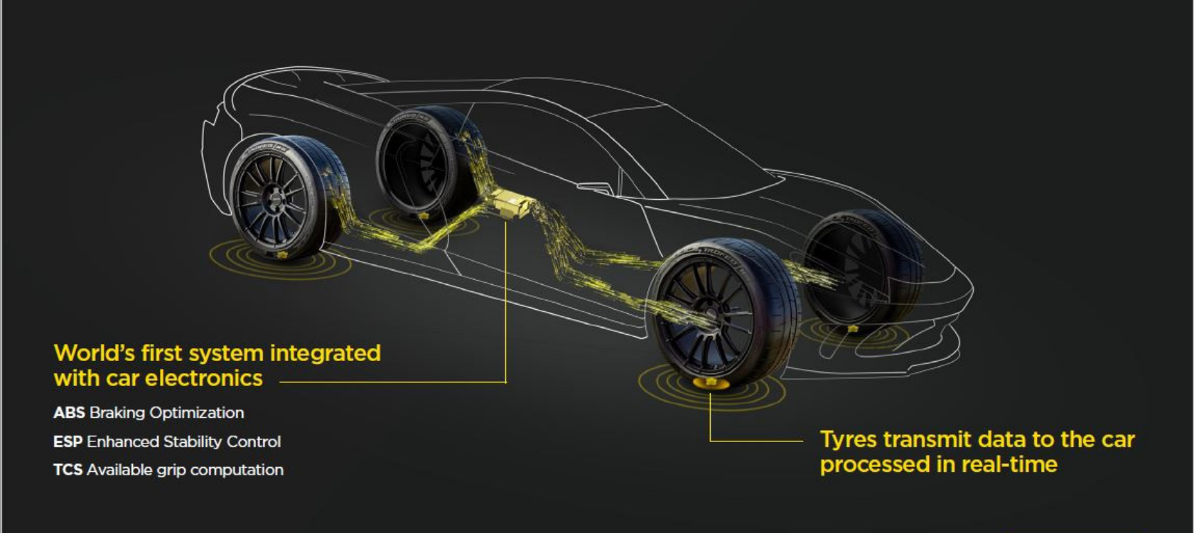 Cyber Tyre continuously analyzes road grip, pressure, and dynamic conditions using data from sensors placed inside the tire. This data optimizes the vehicle's safety and performance while providing the driver with a sharper and safer driving experience.